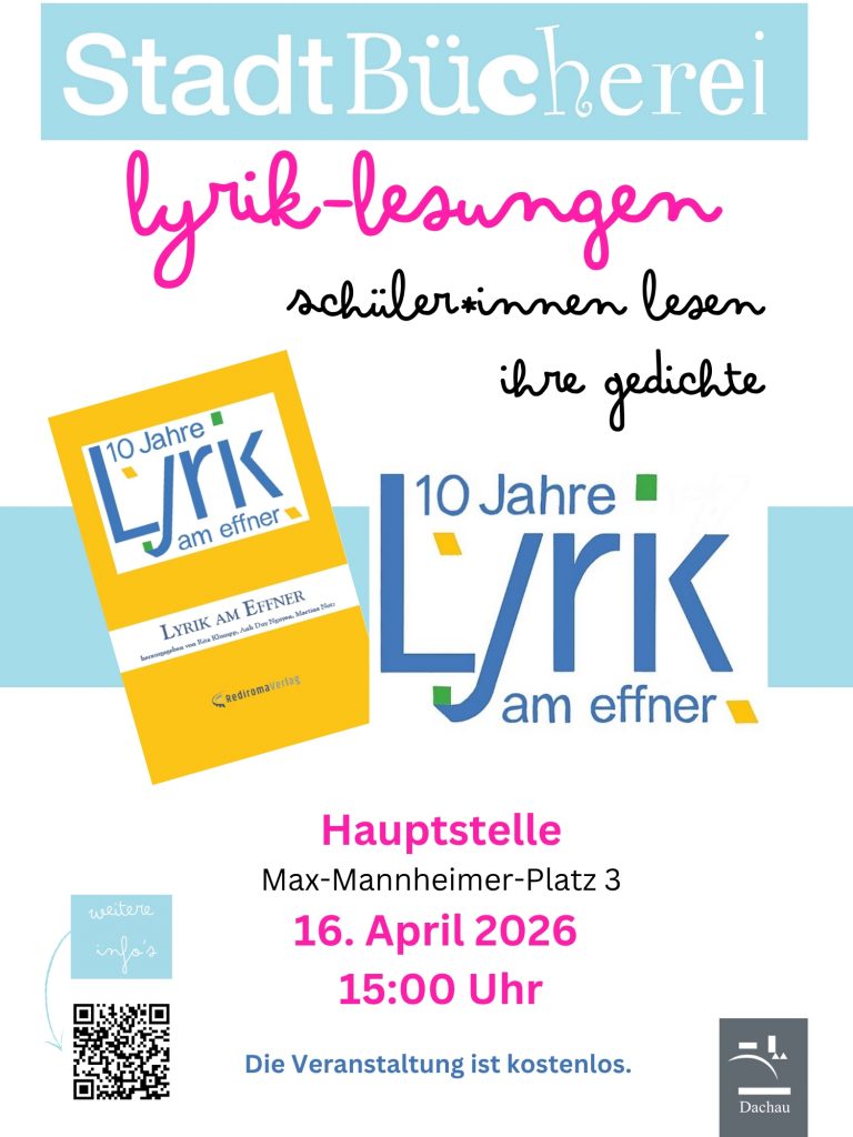 Aktuell ist der zehnte Band „Lyrik am Effner“ in geringer Zahl für 5,00 € an der Schule erhältlich. Bitte wenden Sie sich bei Interesse an Frau Rita Klumpp, Frau Martina Notz oder Herrn Anh Duy Nguyen. Bei der Lesung können Sie die Jubiläumsanthologie ebenfalls kaufen. Außerdem stehen alle bisher erschienenen Bände der Anthologie-Reihe in der Stadtbücherei Dachau zur Ausleihe bereit.
