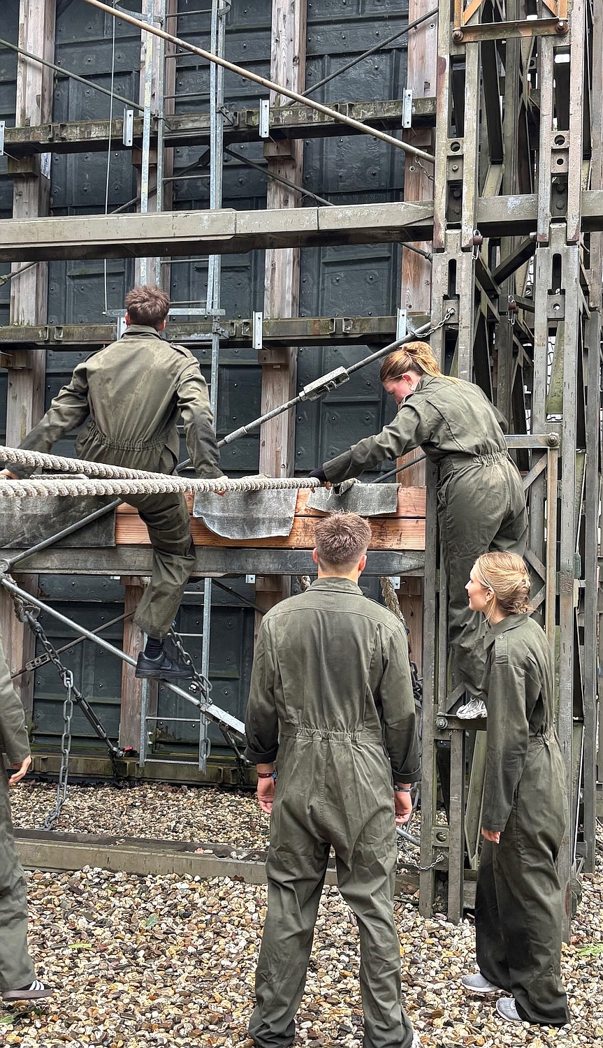 Am nächsten Tag begann das Programm direkt mit einem besonderen Termin: Antoine nahm am Morgen an einer Gedenkfeier im niederländischen Oosterbeek teil, bei der er einen Kranz niederlegte. Nach dem Ende der Zeremonie kehrte er zur Kaserne zurück, wo sich inzwischen auch die niederländischen Teilnehmenden der YOUCEE versammelt hatten. Nachdem wir in passende Overalls gekleidet waren fuhren wir zur Oranjekazerne und nahmen gemeinsam an einem Militärparcours teil. Dieser wurde von einem Soldaten geleitet und stellte sich als körperlich sehr anstrengend, gleichzeitig aber auch als überraschend unterhaltsam heraus. In verschiedenen Übungen wurden Kraft, Ausdauer und Teamarbeit gefordert. Besonders motivierend war, dass auch unser Lehrer Herr Keller aktiv mitmachte, was für viele lustige Momente sorgte und die Stimmung deutlich auflockerte.